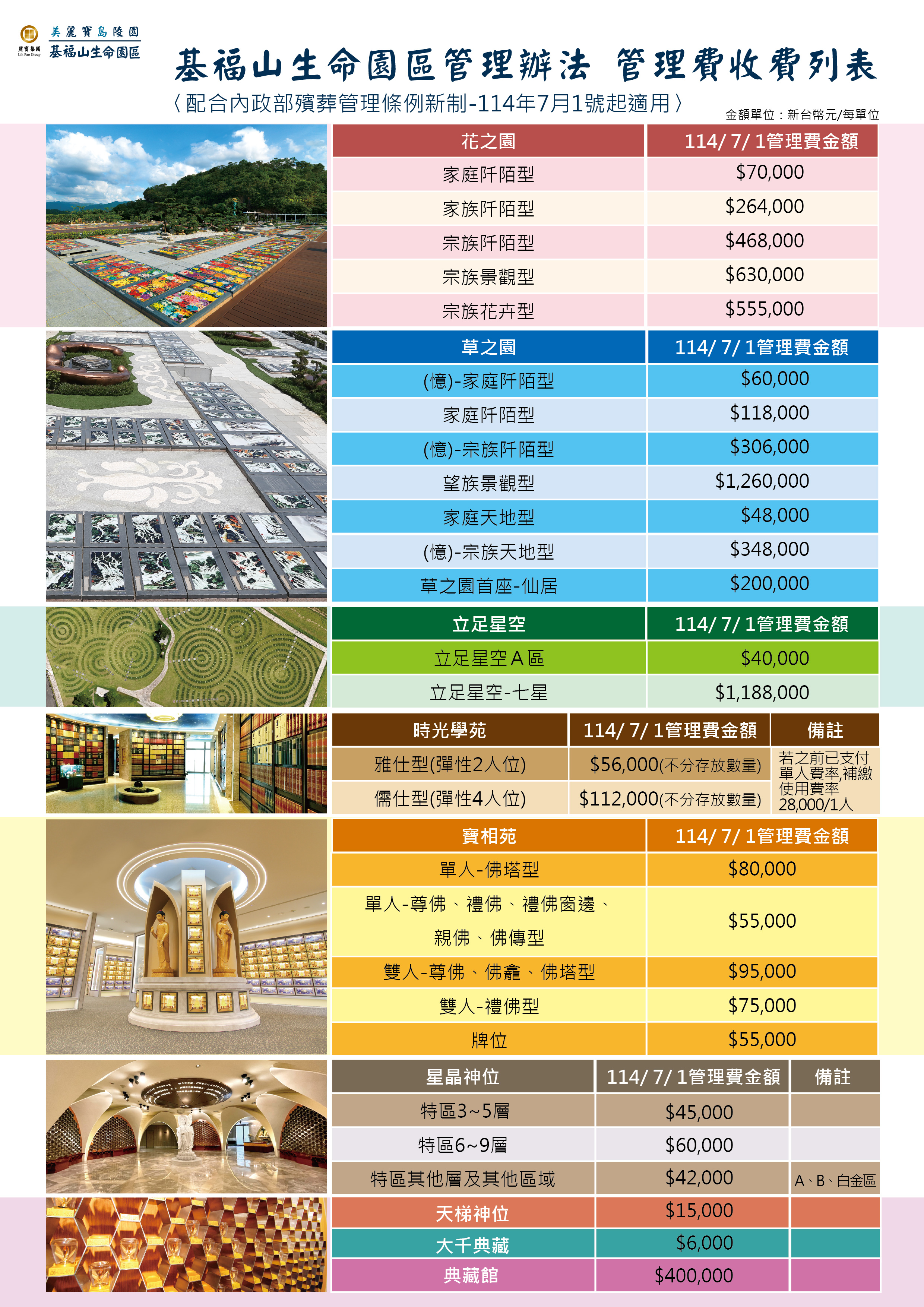 公告:基福山生命園區管理辦法—管理費收費列表-自114年7月1號起生效