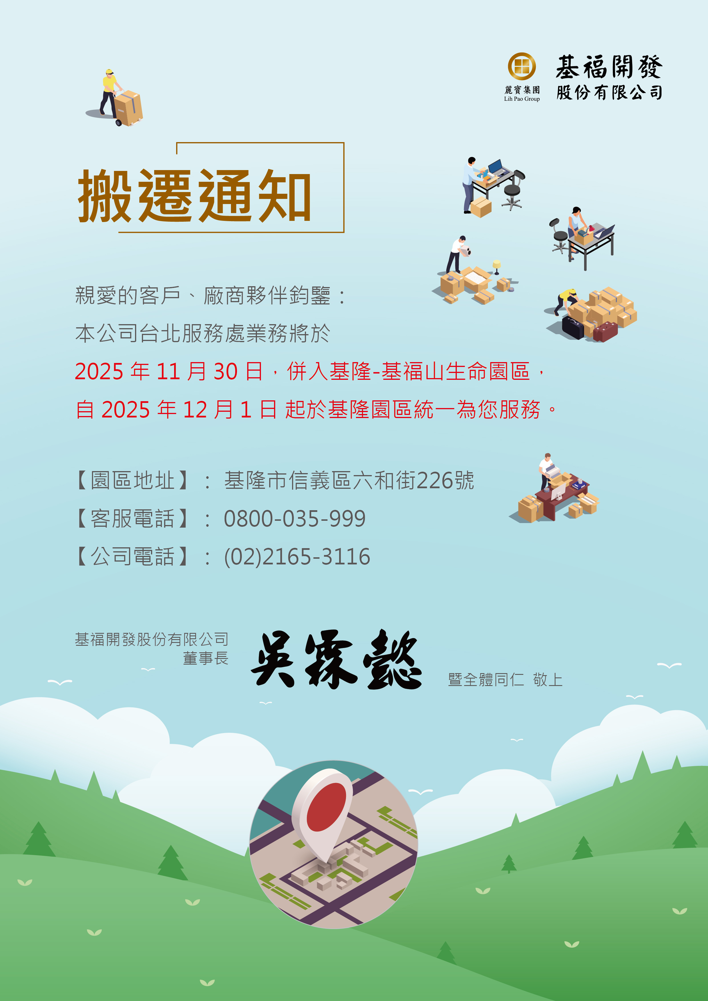【搬遷通知】台北服務處業務併入基隆-基福山生命園區
